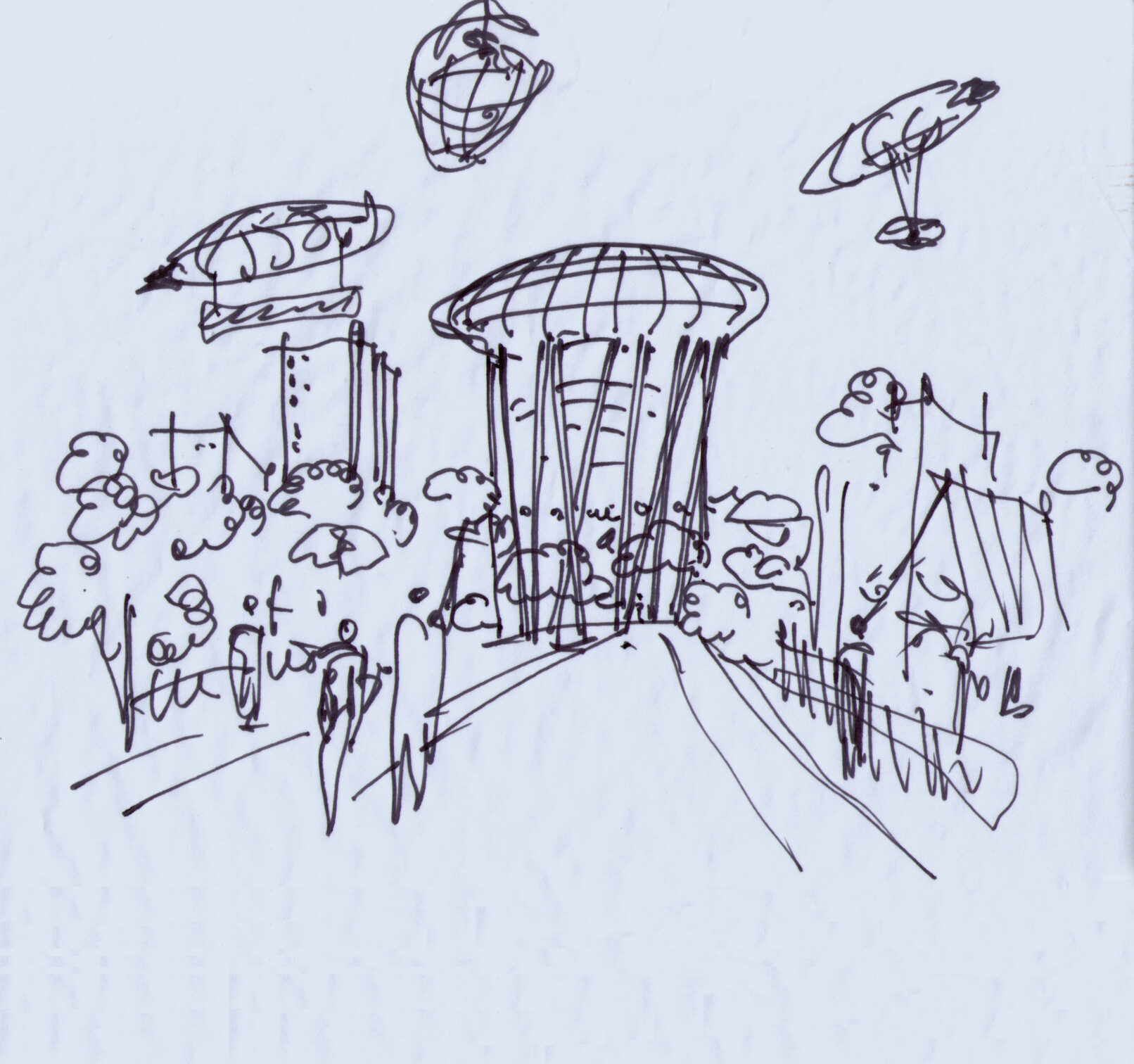 The sloping thin pylons, which are structural elements of the building and go over the stained-glass windows, create the feeling of slings holding up this huge airship.
