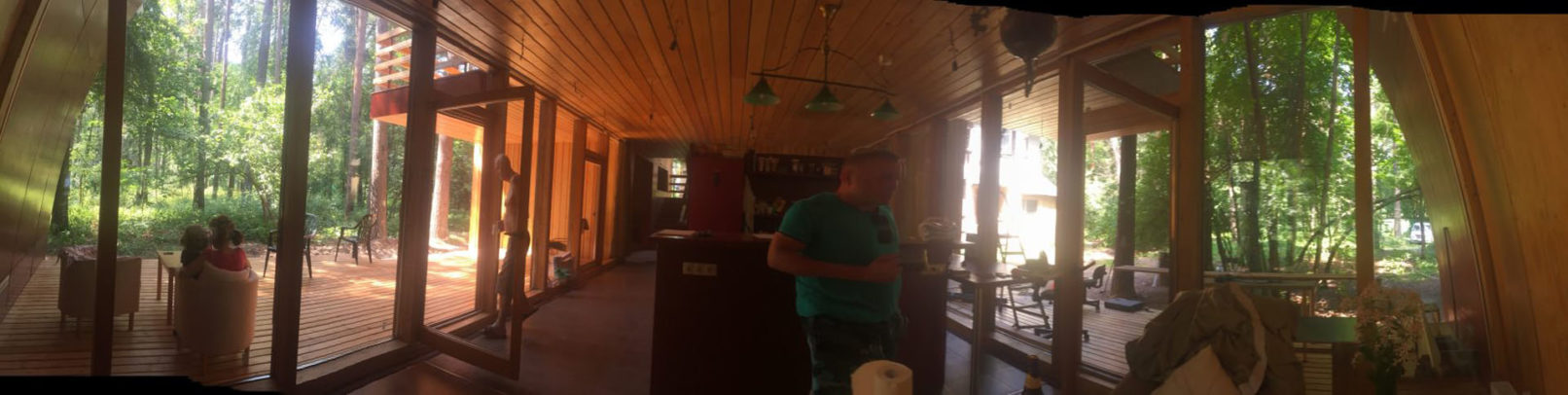 А также благодаря большим витражам на переднем и заднем фасаде, оставить ощущение целостности соснового леса, не разделив его на две отдельные части глухими стенами.