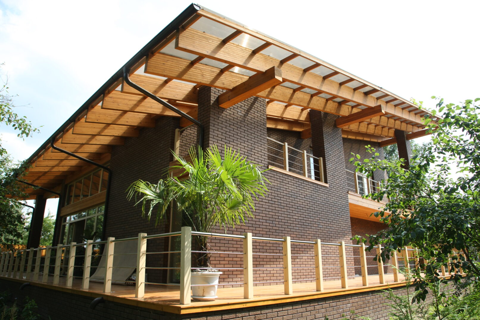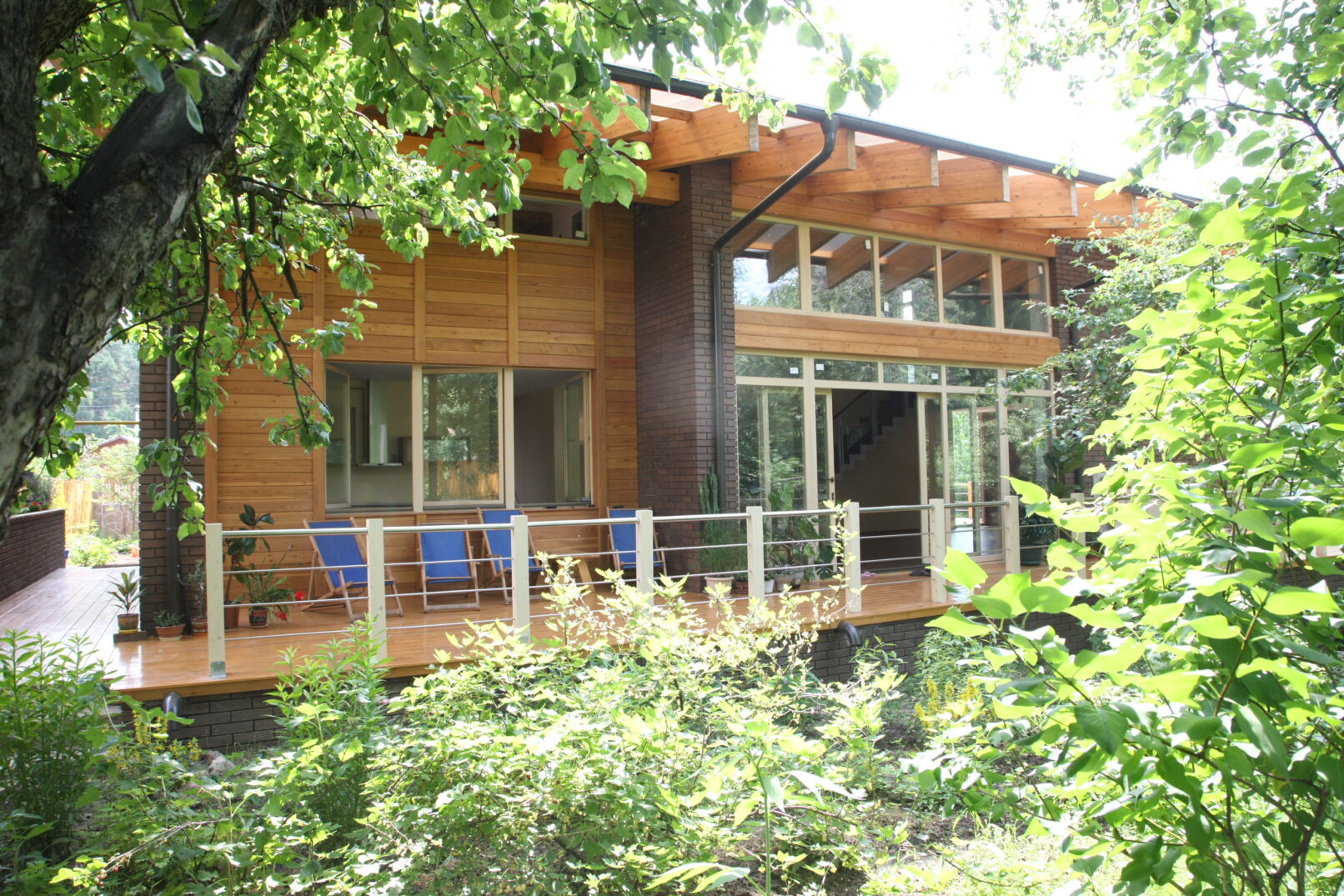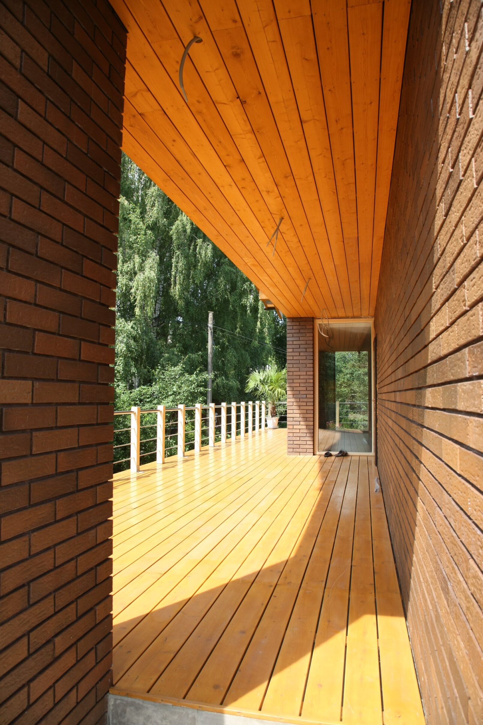 The sunlight partially penetrates the house into the plot through the large stained glass windows on the south and north façade and also creates a feeling of lightness in the airiness inside the house.